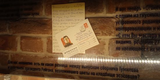 А если войти в квартиру Ахматовой, тоже походить там по всем комнатам и наконец-то оказаться в Белом зале, где уже чисто литературная экспозиция, а не мемориальная, то там стоит несколько витрин, посвященных возвращению стихов Гумилёва к читателю в 1986 году. То есть до этого они ходили в самиздате достаточно широко, но в 1986 году, к 100-летию Гумилёва, они были впервые напечатаны официально, после огромного перерыва в более чем 60 лет, они вернулись в напечатанном виде, в «Огоньке», в 1986 году, в апреле. В апреле был юбилей Гумилёва, 100 лет, но также это был «апрельский», то есть Ленину посвящённый номер. И возмущенные читатели начали в «Огонёк» писать письма: «да что же это такое, да как же это может быть, да еще в «ленинском» номере, да какой-то белогвардеец, вполне заслуженно осужденный, а забытый уж точно заслуженно, и что он здесь делает? и как же мы будем нашу молодежь воспитывать после этого?». Это были не единичные письма, их было довольно много.