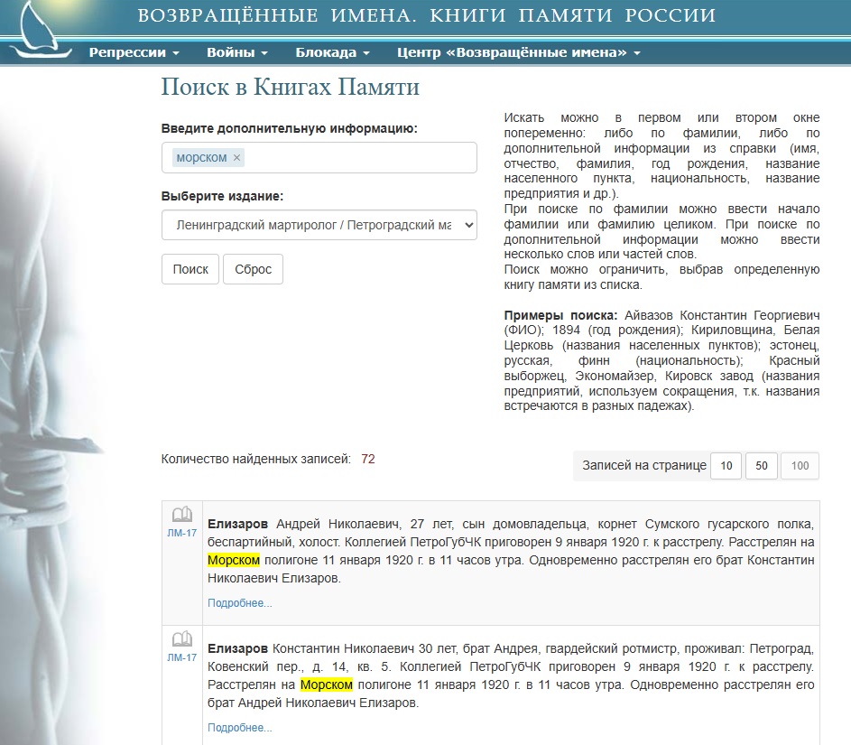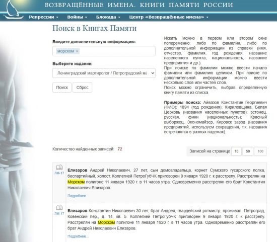 Вот мы всё это теперь в электронном виде публикуем, чтобы имена были доступны. Вы ведь впервые узнаете, что они на Морском полигоне расстреляны, а не у стен Петропавловской крепости или еще где-то… Теперь мы знаем – расстреляны на Морском полигоне. И вот это наша ежедневная работа. … Морской полигон – это Ржевский полигон.